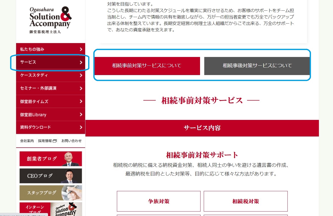 「相続事前対策サービス」と「相続事後対策サービス」に分けて、サービス内容をご提示しております。