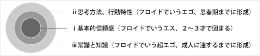 人間の心は下図のように3層構造になっています。そのベースは人生に対する基本的信頼感です。この有無は父母、特に母親との関係で決まります。赤ちゃんのころ母親との豊かな交流関係があったかどうかなのです。このことが、人生と自分・他者に対する心構えを決定します。そして、その後の人生の体験が人間の環境に対する対処パターン、つまり、人柄を形成していきます。さらに、いちばん外側には、大人としての生きていくために身につけた常識や知識の硬い殻があるのです。