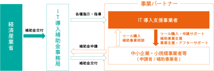 申請者(中小規模事業者)とIT導入支援事業者は、補助事業を実施する上での『パートナー』となり生産性向上を目的とし、共に補助事業に取り組むことが求められます。IT導入支援事業者が事務局に事前に登録した『ITツール』の中から選択し、交付申請を行います。