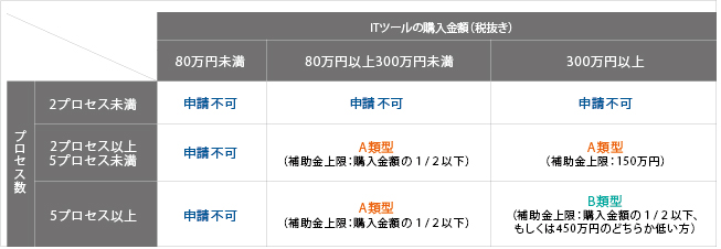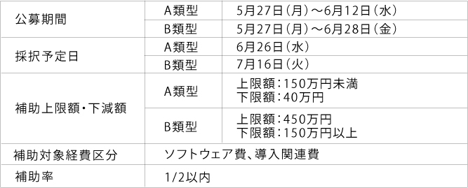 補助金の交付申請・事業実施期間、上限・下限額、補助率は、上記の通りとなります。補助上限額によって2種類の型に分けられており、交付申請期間も異なります。A類型については交付申請期間が2週間しかないため、事前にITツールの選定・見積等の事前準備を進めておく必要があります。