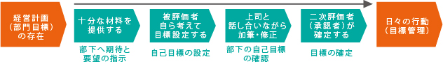 次に一人ひとりの課題にしぼります。会社が従業員に対して伸ばしていってもらいたい点や改善してほしい点があるので、上司の意向を聞いて目標項目を文章にしたためていけばよいのです。 企業の方針が個人の目標に落とし込まれているため、企業方針の理解ができるのです。双方が納得すれば、あとは「よーいドン!」 でスタート。上司はそれを遂行させるためのサポート役に徹し、本人は目標に向かって邁進していくのです。