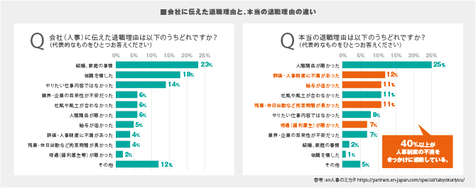 上図はエン転職が転職者へ実施した、「会社に伝えた退職理由と、本当の退職理由の違い」に関するアンケート結果です。会社に伝えた退職理由は、グラフにある通り、結婚や家庭の事情、体調面などが多くありますが、本当の理由はというと、大きく数字が変わります。評価制度や人事制度、労働環境など、会社が改善できる人事制度の不満をきっかけに退職しています。社員は、「給与や評価が低かったので、会社を辞めます」とは会社には伝えません。社長は、「仕事に見合った給与を与えたい」と思っています。社員は、「給与に見合った仕事をしたい」と思っています。ここにギャップが存在します。人事制度は、改善し続けることによって社員の生産的な行動を引き出すことはできますが、大きな生産性が生まれるものではありません。中でも給与制度は、構築できていないと社員の不満に直結し、退職の引き金になってしまいます。