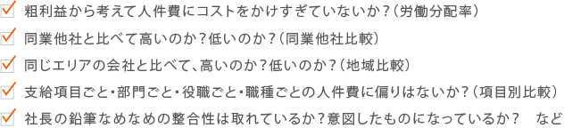 給与データをもとに、様々な視点で分析を行い、定量的な課題を抽出します。たとえば、下記のような視点で給与診断を行います。