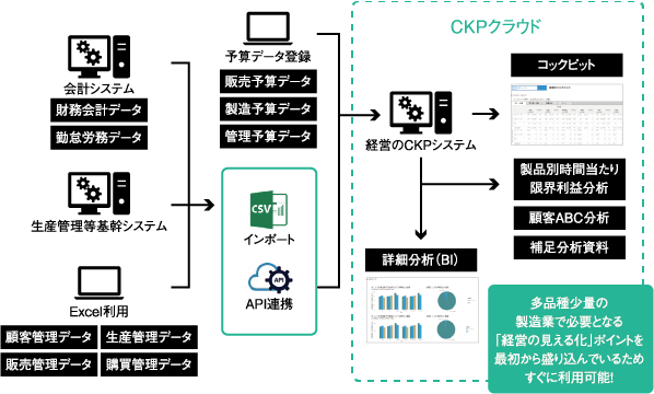 CKPクラウドでは、基幹システムや会計からのデータをCSV形式で一括で取り込んだり、システムによってはAPI連携と呼ばれる仕組みで、自動的に反映させることができるため、コックピット資料作成の負荷が大幅に削減されます。