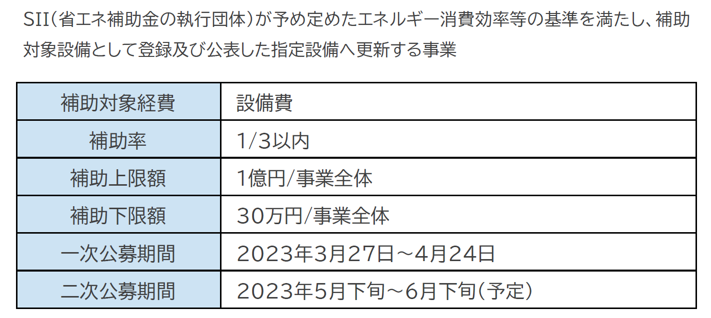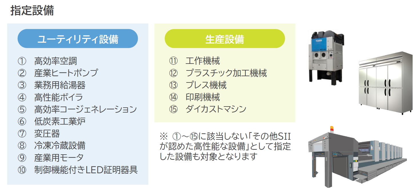 SII(省エネ補助金の執行団体)が予め定めたエネルギー消費効率等の基準を満たし、補助対象設備として登録及び公表した指定設備へ更新する事業