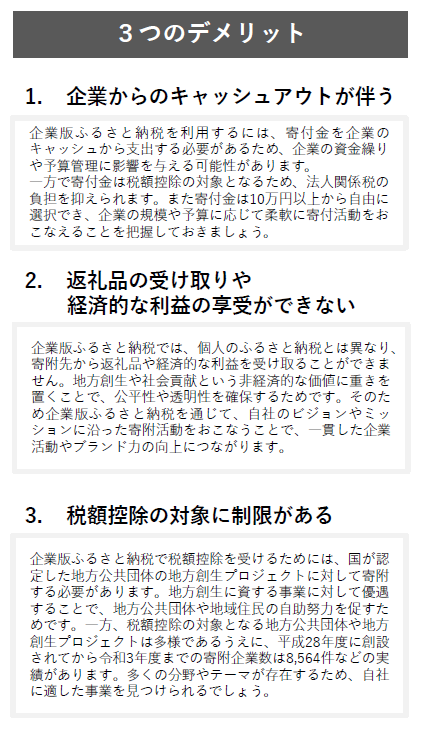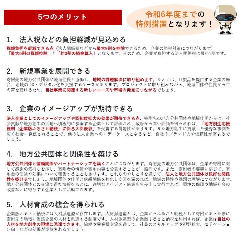 企業版ふるさと納税制度は、地方の課題に対して企業が社会的責任を果たすことで、持続可能な社会を目指すとしています。そのため個人のふるさと納税とは異なり、寄附先から返礼品や経済的な利益を受け取れません。