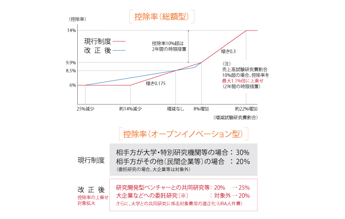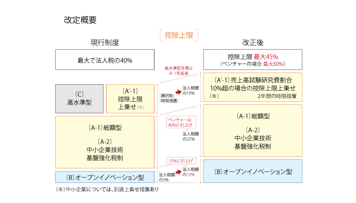 オープンイノベーション型は控除税額の上限を現行5%から10%に引き上げ。